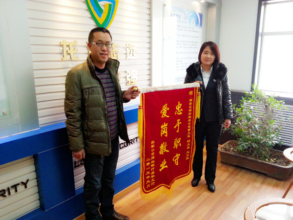 2015年1月份,一位八十多歲高齡的老人到張家口市商業(yè)銀行某支行辦理取錢(qián)業(yè)務(wù)時(shí),因老人年事已高患有老年病,與銀行的工作人員發(fā)生了沖突,無(wú)論工作人員如何解釋?zhuān)詿o(wú)法溝通,至此,老人經(jīng)常到該行找工作人員滋事,老人的行為嚴(yán)重影響到支行的正常業(yè)務(wù),為客戶(hù)辦理業(yè)務(wù)帶來(lái)了不便,為維護(hù)好銀行正常秩序,我公司派駐支行的保安隊(duì)員顧龍液、王文來(lái),主動(dòng)接近老人進(jìn)行勸阻,交流溝通,問(wèn)寒問(wèn)暖,緩解老人心態(tài)。之后我公司曹文平隊(duì)長(zhǎng)得知此事,也趕到支行協(xié)助處理,幫忙找到了老人的家人,在家人的勸說(shuō)下,老人離開(kāi)了支行,支行恢復(fù)了正常的工作秩序。經(jīng)過(guò)此事,我公司保安大隊(duì)長(zhǎng)曹文平及派駐到張家口市商業(yè)銀行的保安隊(duì)員顧龍液、王文來(lái)受到了張家口市商業(yè)銀行支行領(lǐng)導(dǎo)的高度贊揚(yáng),特到我公司送來(lái)了錦旗與表?yè)P(yáng)信,對(duì)我公司進(jìn)行感謝。